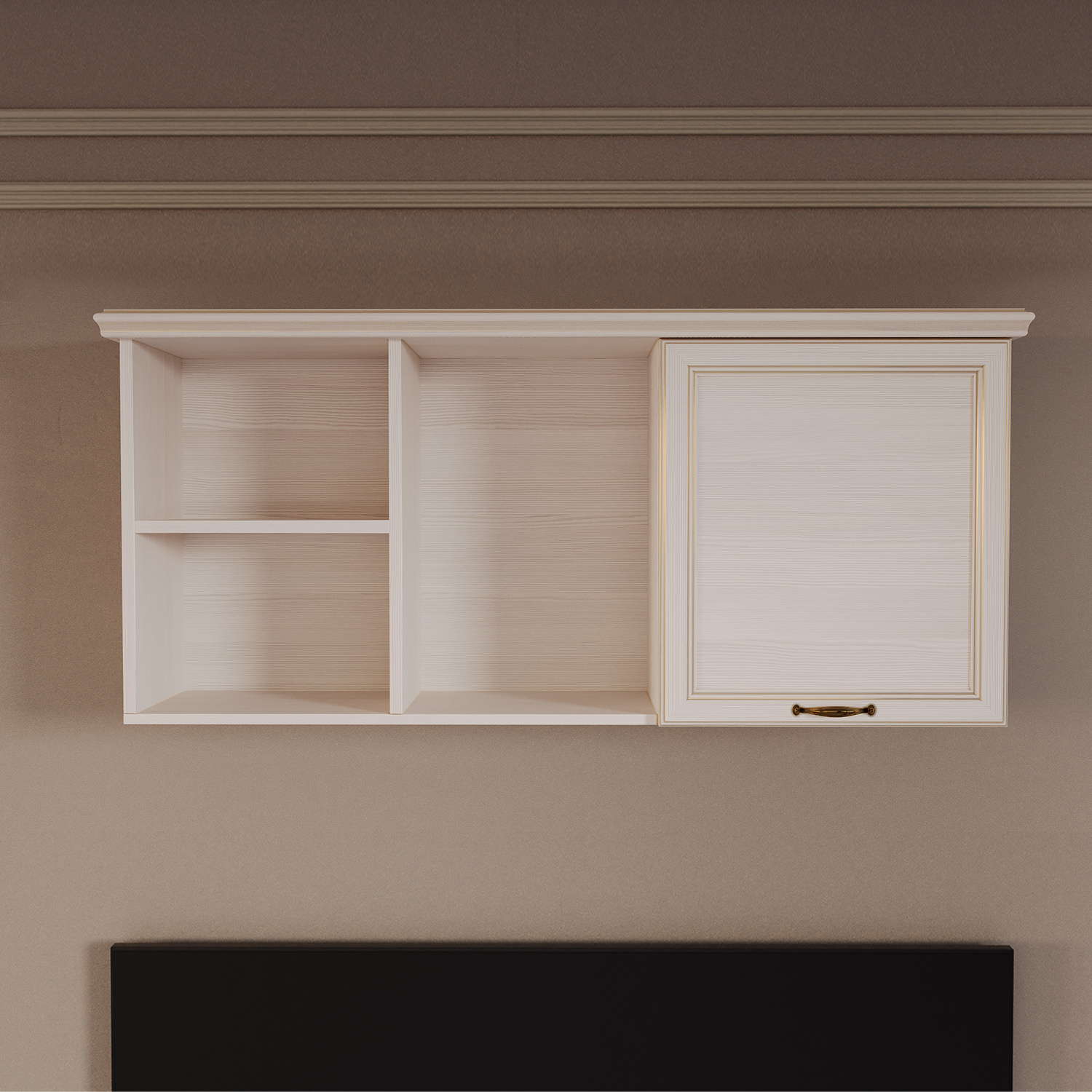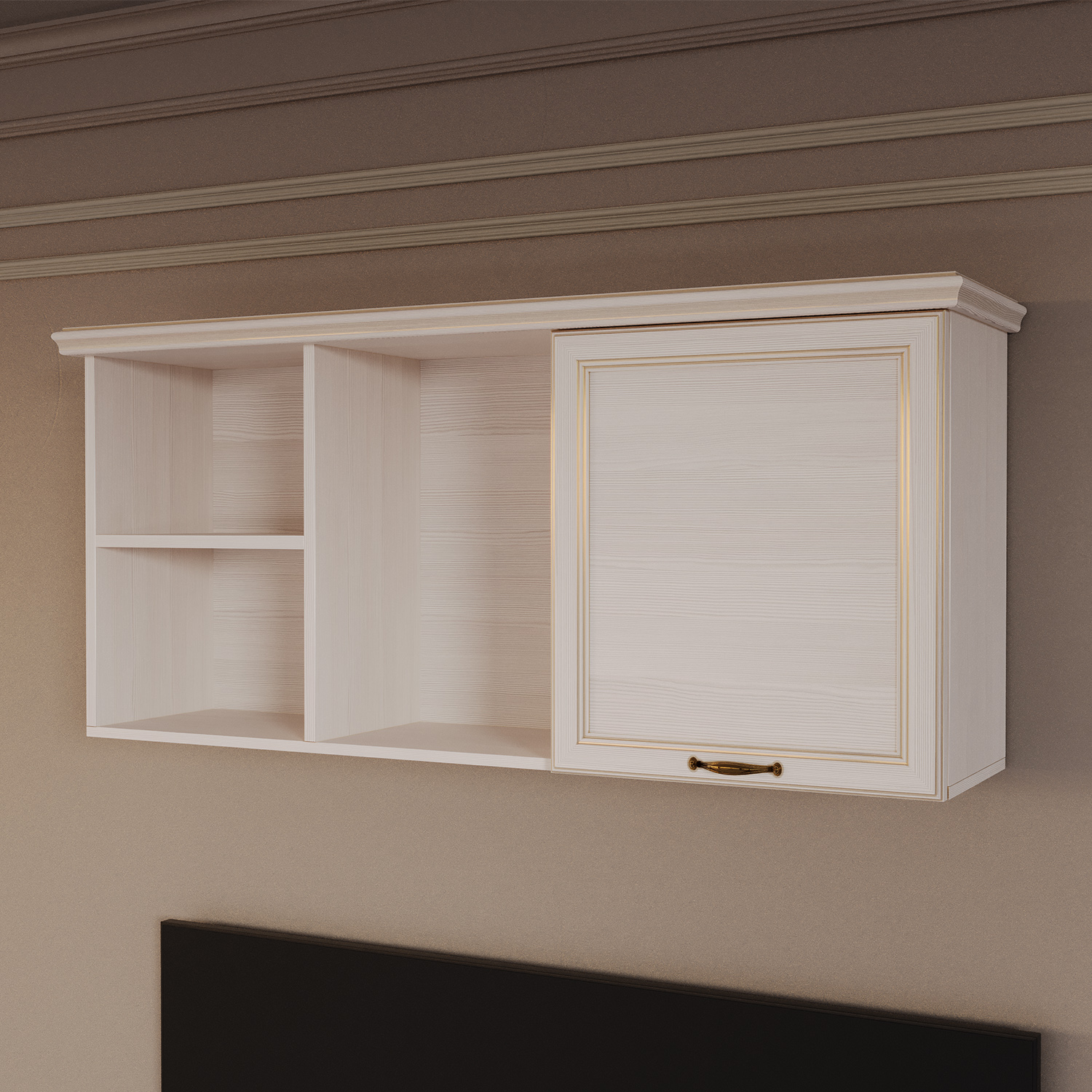 Дизайн модуля соответствует классическому стилю коллекции «Сиена». Корпус изготовлен из светлого ЛДСП «Бодега белый», а в качестве декора применяются профиль МДФ в плёнке ПВХ в цвет корпуса. Золотое патинирование деталей придает мебели роскошный и изысканный вид. Металлическая ручка цвета «старая бронза» украшает дверку.