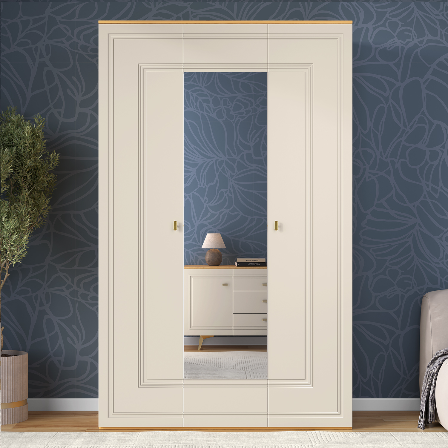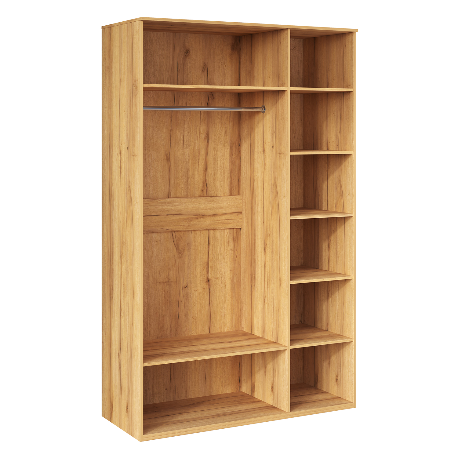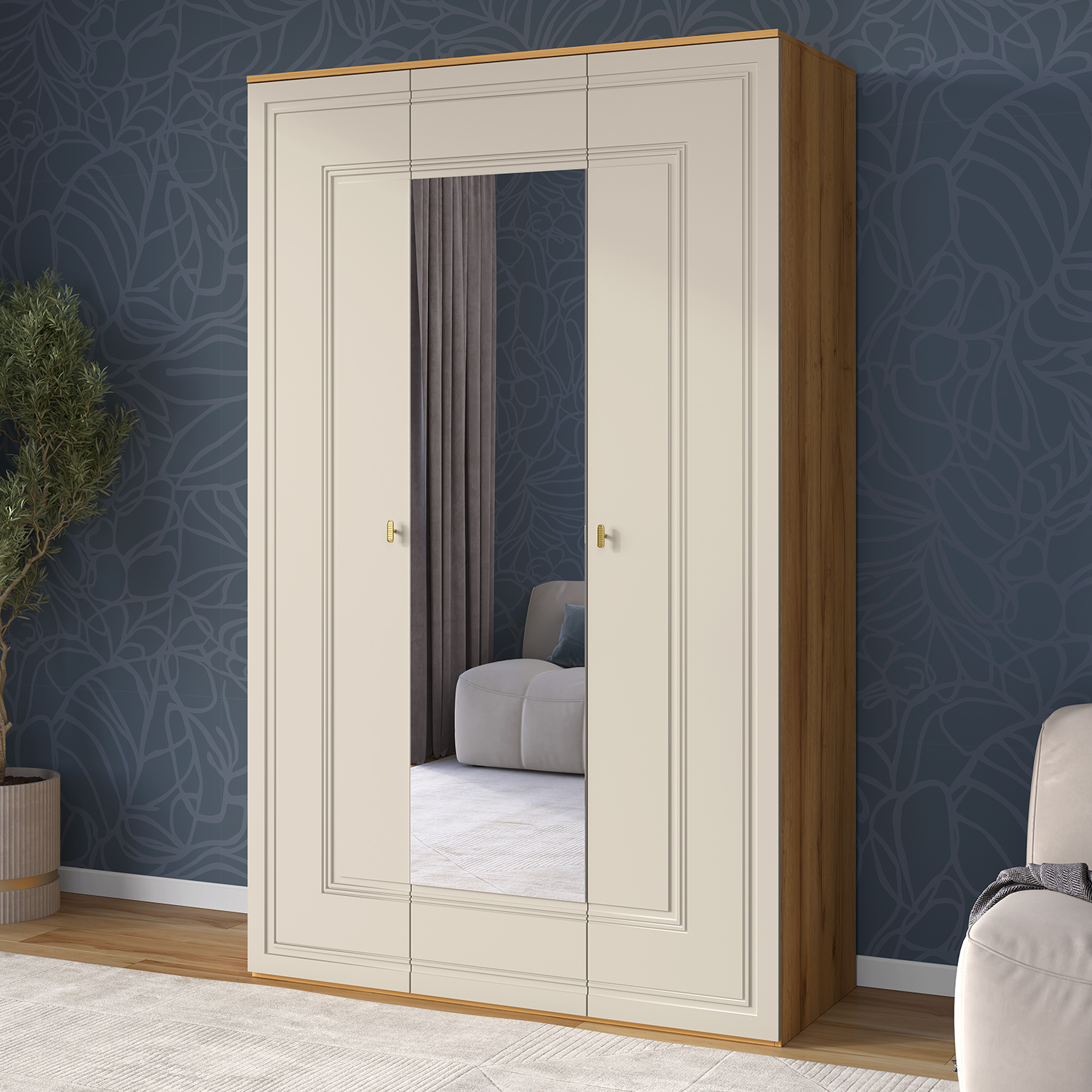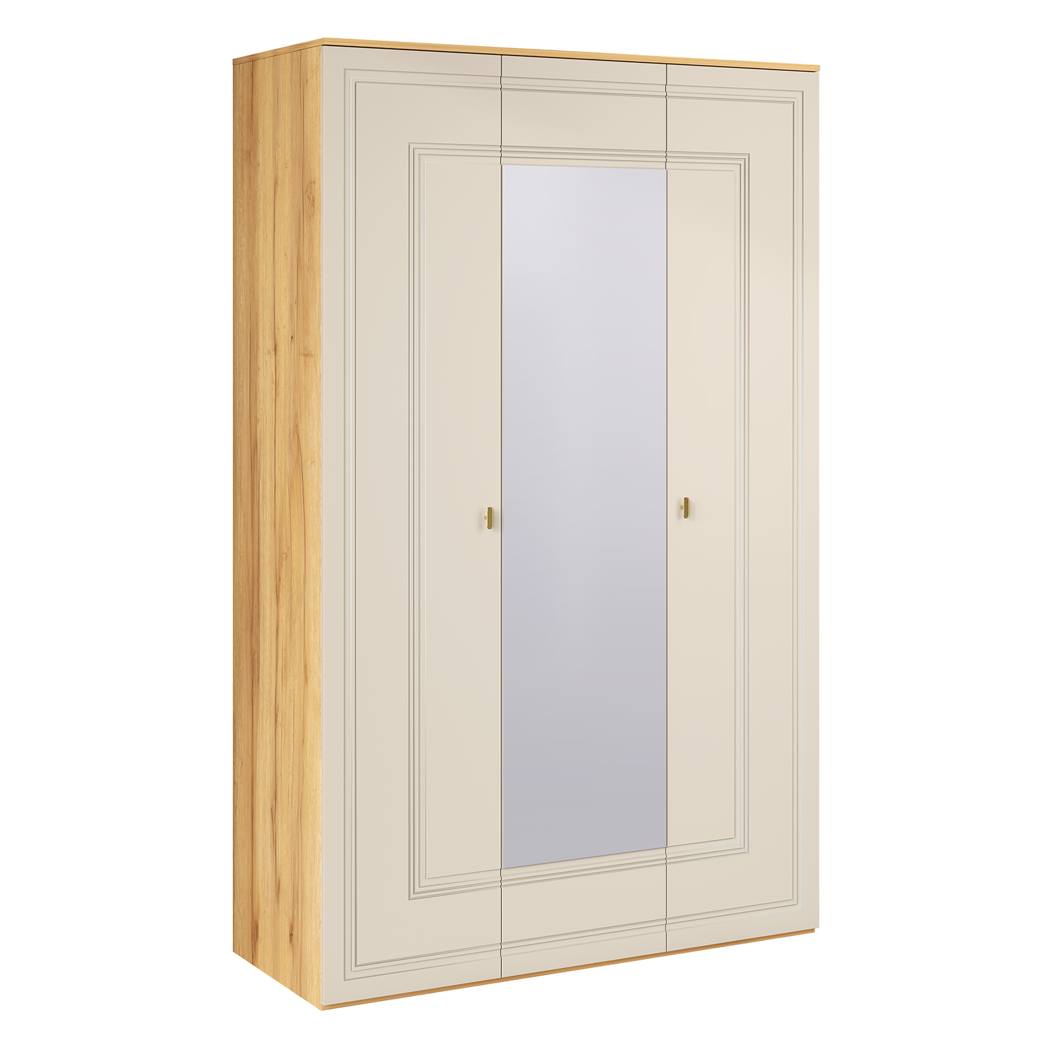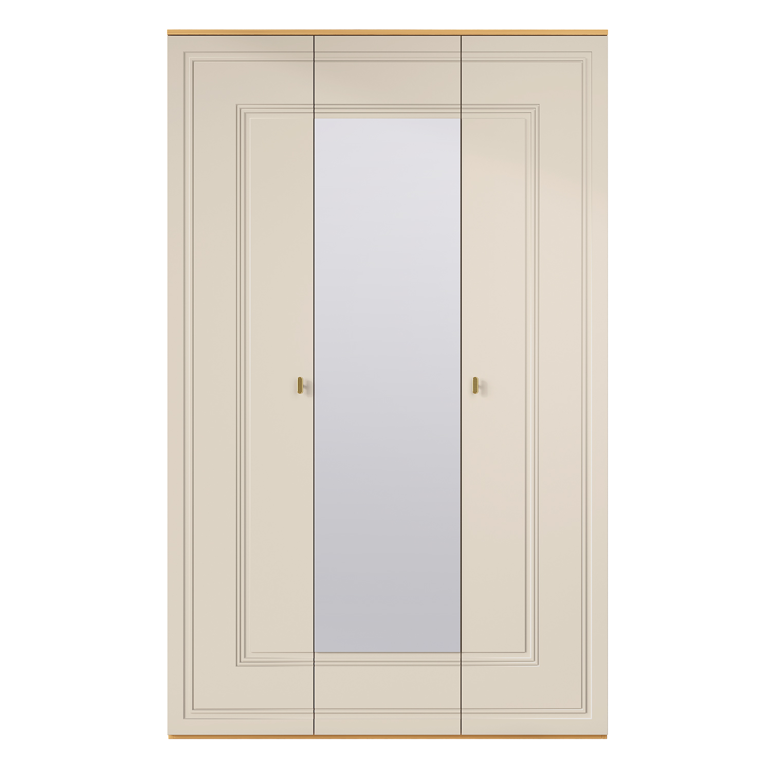 Шкаф для одежды оснащен штангой и полками для хранения. Шкаф трехдверный комплектуется глухими и зеркальным фасадом. Материал фасадов – МДФ в пленке ПВХ – глянцевой или матовой в зависимости от исполнения.